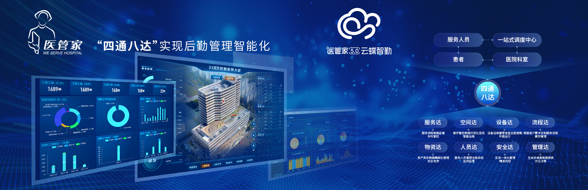 八達(dá):“醫(yī)管家5.0云蝶智勤”系統(tǒng)可實(shí)現(xiàn):空間達(dá),樓宇管控?cái)?shù)據(jù)可視化呈現(xiàn),智能運(yùn)維;設(shè)備達(dá),設(shè)備運(yùn)維管理信息全面搭載,平穩(wěn)運(yùn)行;物資達(dá),資產(chǎn)庫存數(shù)據(jù)精細(xì)化管理,安全有序;人員達(dá),服務(wù)人員管理全面系統(tǒng),監(jiān)崗監(jiān)責(zé);流程達(dá),根據(jù)客戶需求定制服務(wù)流程,高效管理;管理達(dá),生成多維度數(shù)據(jù)報(bào)表,優(yōu)化決策;安全達(dá),安消一體化管理,精準(zhǔn)防控;服務(wù)達(dá),服務(wù)流程數(shù)據(jù)監(jiān)管,實(shí)時(shí)掌控。