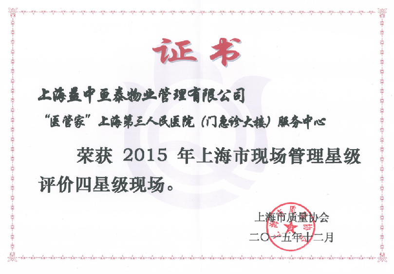 現(xiàn)場(chǎng)管理是企業(yè)管理的核心組成部分,是企業(yè)發(fā)展的堅(jiān)實(shí)基礎(chǔ)。2015年12月,上海益中亙泰物業(yè)管理有限公司(醫(yī)管家)上海仁濟(jì)醫(yī)院以及上海第三人民醫(yī)院(門(mén)急診綜合大樓)服務(wù)中心分別榮獲2015年上海市現(xiàn)場(chǎng)管理星級(jí)評(píng)價(jià)五星級(jí)現(xiàn)場(chǎng)和四星級(jí)現(xiàn)場(chǎng)。