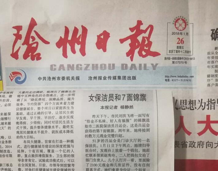 雖然每月只有千余元工資,但她安穩(wěn)、踏實(shí),面對(duì)巨額現(xiàn)金,絲毫不動(dòng)心。幾年前,呂運(yùn)會(huì)和丈夫雙雙下崗,她在醫(yī)院干保潔,丈夫則在某小區(qū)當(dāng)保安。這些年來,她不知撿到過多少次現(xiàn)金、手機(jī)和錢包,有的失主當(dāng)面給錢致謝,她拒絕了,還有的事后專門送來了錦旗。她說:“誰丟了東西都著急,更何況在醫(yī)院丟的都是救命錢?!?