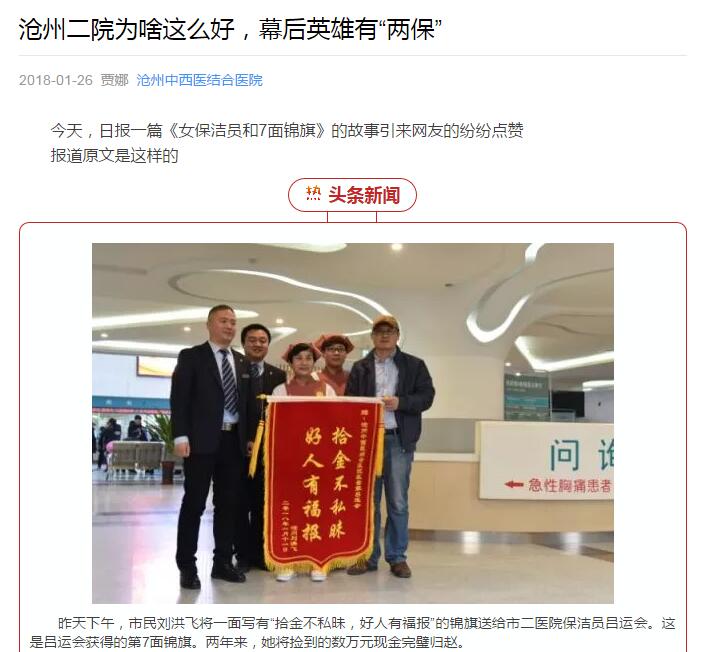 多年來,呂運(yùn)會(huì)在門診大廳“撿漏”的總金額經(jīng)過統(tǒng)計(jì)已超過數(shù)萬元,而她與7面錦旗的故事經(jīng)過河北省滄州中西醫(yī)結(jié)合醫(yī)院、《滄州日?qǐng)?bào)》報(bào)道和發(fā)酵后在網(wǎng)上引起了一段熱傳,她的熱心敬業(yè)、樸實(shí)善良深深的感動(dòng)著生活在各個(gè)階層的人,正如有些網(wǎng)友的評(píng)論一般“如果 換成一個(gè)不這么細(xì)致認(rèn)真的工作的人去那,估計(jì)一分錢也撿不到”。
