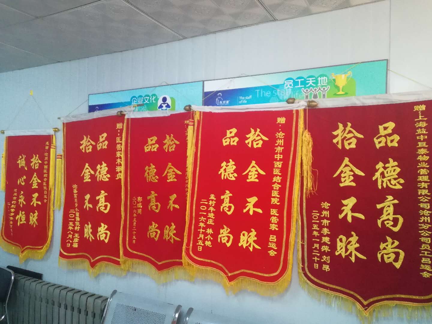 在休息室,掛滿了保潔團(tuán)隊(duì)收到的