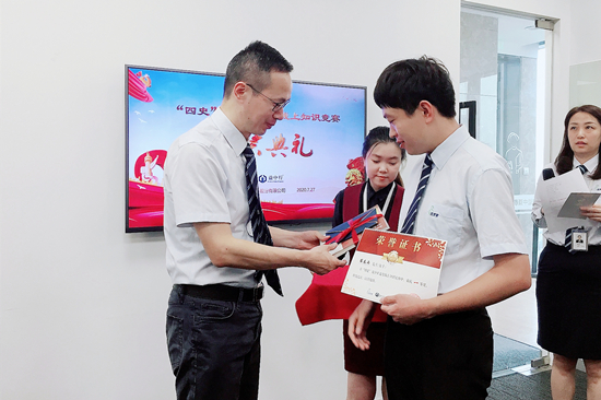 文化凝聚力量,黨建引領方向。7月27日上午,益中亙泰集團“四史”(黨史、新中國史、改革開放史、社會主義發(fā)展史)知識競賽頒獎典禮在上??偛柯≈嘏e行。集團總裁、黨支部書記朱春堂為來自全國各地的一、二、三等獎獲獎員工代表頒發(fā)了證書和獎品。