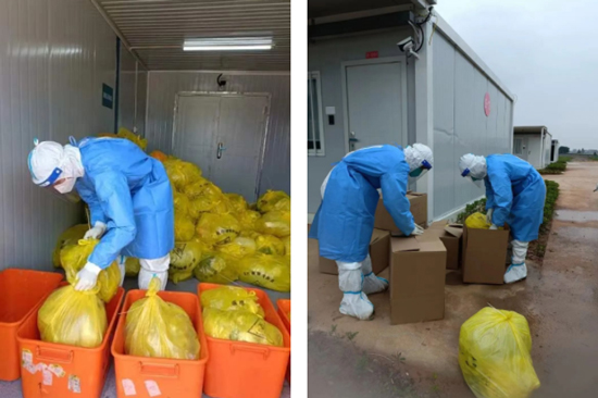 醫(yī)廢收集是方艙醫(yī)院的重要工作之一,為切實(shí)保障方艙醫(yī)院醫(yī)廢垃圾“日產(chǎn)日清”,“醫(yī)管家”金西方艙醫(yī)院后勤保障團(tuán)隊(duì)成立“醫(yī)廢收集小組”,由環(huán)境管理部工勤員邵孝華帶領(lǐng),每天兩次進(jìn)艙收集,每一袋垃圾從消殺-扎帶-再消殺-再扎帶-裝箱-消殺,各個環(huán)節(jié)均嚴(yán)格按照醫(yī)廢處理標(biāo)準(zhǔn)操作。他們在30多度的高溫下,身穿厚厚防護(hù)服、外套隔離衣,一箱箱搬運(yùn)裝車卸車;在病人進(jìn)艙的高峰,工作量面臨極大的挑戰(zhàn);小組有的員工在艙內(nèi)工作時出現(xiàn)了中暑等癥狀,在出艙簡單休整后立即又返回艙內(nèi)堅(jiān)持工作;確保艙內(nèi)醫(yī)廢及時的清理轉(zhuǎn)運(yùn),嚴(yán)守院感“紅線”。