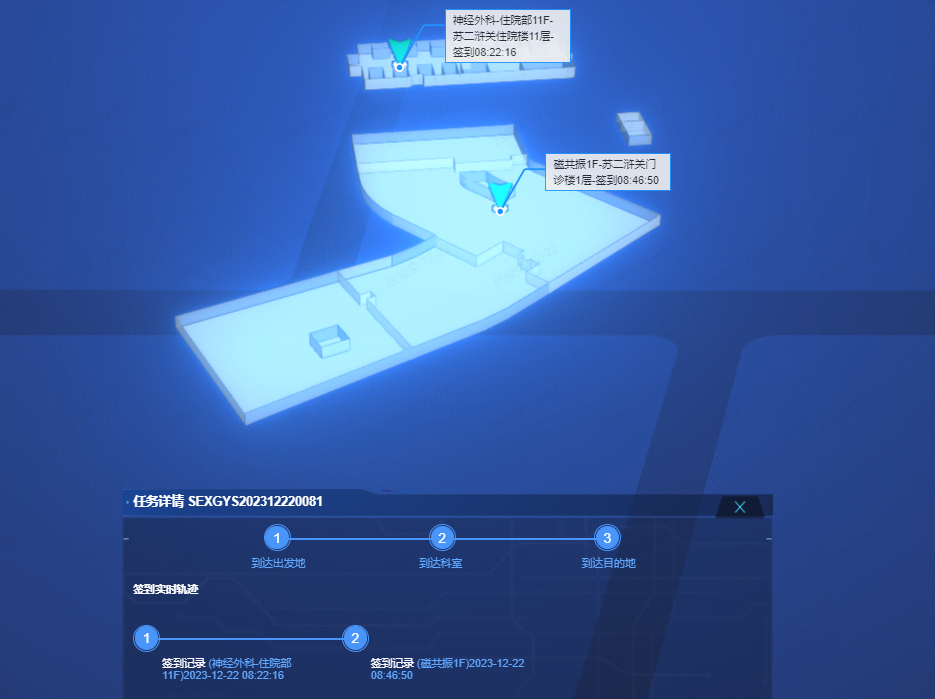可在每一個運送環(huán)節(jié)通過掃碼拍照,上傳當前運送進度,運送工單軌跡結(jié)合BIM模型展現(xiàn),便于系統(tǒng)及時更新任務完成數(shù)據(jù),形成閉環(huán)管理。系統(tǒng)上線后一個月內(nèi)安全閉環(huán)了11000+運送服務工單,工單完成率保持在100%,大大保障了醫(yī)院的高效運營。