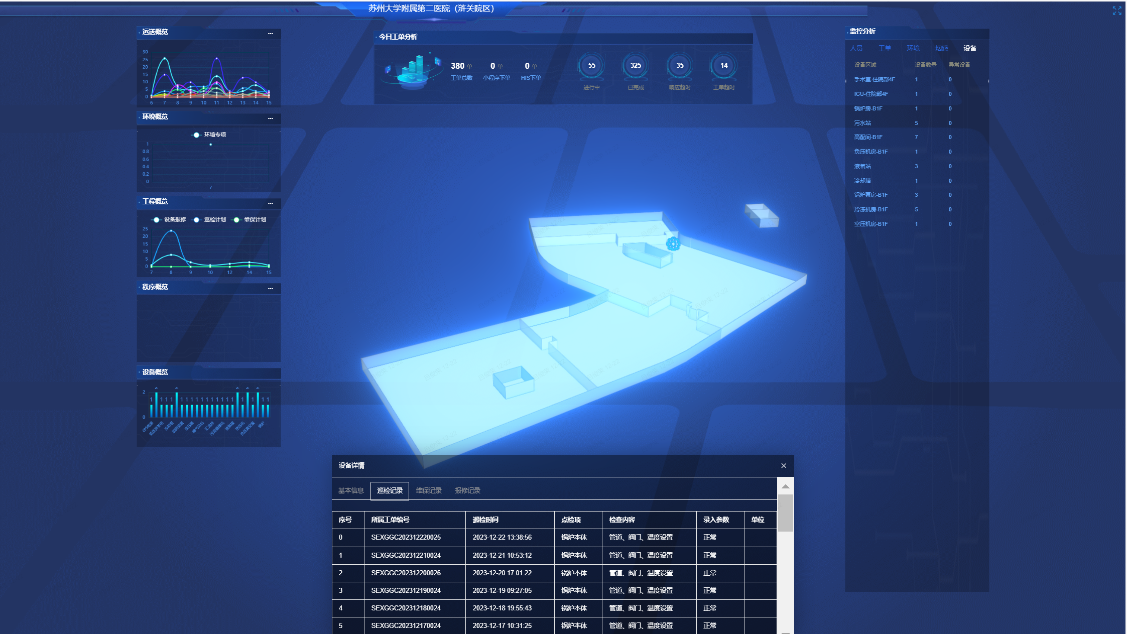 系統(tǒng)上線后涵蓋了環(huán)境管理、中央運送、工程管理等多條線服務內(nèi)容,在全院共設(shè)立226個設(shè)備和科室數(shù)據(jù)點位,為蘇州大學附屬第二醫(yī)院(滸關(guān)院區(qū))構(gòu)建起人與空間、人與服務、服務與空間的三角模型,錄入1100+條維修物料信息,并可實現(xiàn)數(shù)據(jù)多源共享,支持WEB、APP、平板PAD、微信小程序等多端數(shù)據(jù)同步,實現(xiàn)醫(yī)院科室、調(diào)度中心、服務人員、患者等多方的信息互通互聯(lián),為醫(yī)院提供管理決策依據(jù),助力醫(yī)院更高水平的建設(shè)。