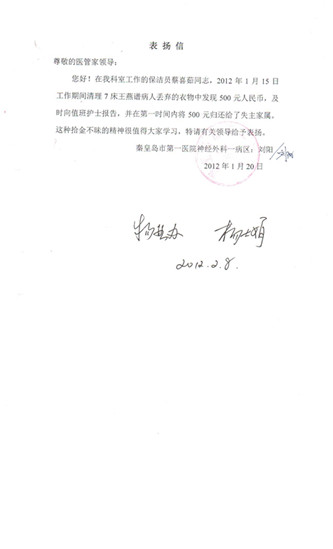 近日,我秦皇島市第一醫(yī)院服務(wù)中心和紹興第二醫(yī)院服務(wù)中心喜獲來自秦皇島市第一醫(yī)院和紹興第二醫(yī)院耳鼻喉科護(hù)士長(zhǎng)的來信,特對(duì)我公司蔡喜茹和王德發(fā)兩位員工提出表?yè)P(yáng)。
