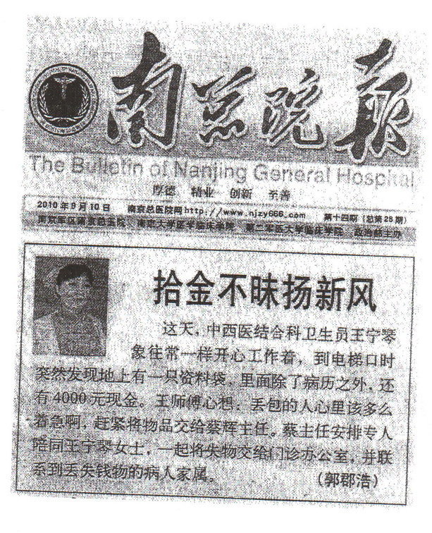 南京軍區(qū)總院是我公司所服務(wù)的項目之一,在9月10日的《南總院報》報道了我項目員工王寧琴拾跡不昧的事跡,文中是這樣寫的: