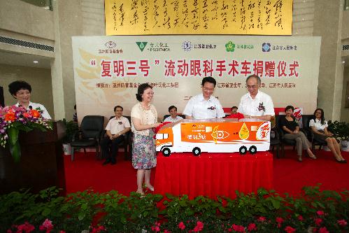 2010年8月23日 上午,新“復明三號”流動眼科手術車捐贈儀式在江蘇省人民醫(yī)院隆重舉行。在捐贈儀式上,江蘇省人民醫(yī)院院長王虹代表數以萬計的白內障患者感謝亞洲防盲基金 會等多年來為江蘇復明扶貧事業(yè)做出了巨大貢獻,同時還特別感謝各級政府,高度重視和大力支持使復明扶貧工作得以順利開展。