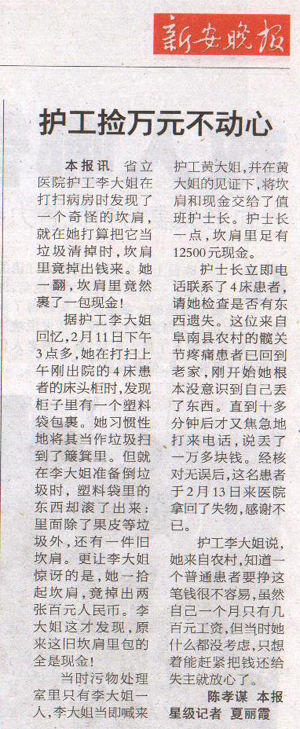 2月11日下午,我安徽省立項(xiàng)目保潔員工黃廷貴、李昌珍兩位大姐在打掃病房時(shí)發(fā)現(xiàn)上午剛出院的病床旁的床頭柜里有一舊衣服,打開一看,里面竟裹了一包現(xiàn)金,她倆當(dāng)即將衣服和現(xiàn)金如數(shù)地交給護(hù)士長(zhǎng)。護(hù)士長(zhǎng)立即電話聯(lián)系,很快就找到了失主,失主感激不盡。黃廷貴和李昌珍兩位大姐的月工資只有幾百元,但她們撿到相當(dāng)于自己一年工資的現(xiàn)金時(shí)毫不動(dòng)心。