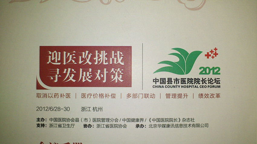 由中國(guó)醫(yī)院協(xié)會(huì)縣市醫(yī)院管理分會(huì)主辦的,迎醫(yī)改挑戰(zhàn),尋發(fā)展對(duì)策的會(huì)議在浙江杭州美麗的太虛湖酒店召開(kāi)了。