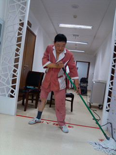 我知道保潔阿姨早上工作是很忙碌的,我也很擔(dān)心因為我而延遲她們的工作進(jìn)度,當(dāng)著急的我一口氣拖好五間病房時,早已經(jīng)是滿頭大汗,身上也汗?jié)窳恕4藭r我想,阿姨們真不容易,干凈、整潔的病房都是她們用辛勤汗水換來的。